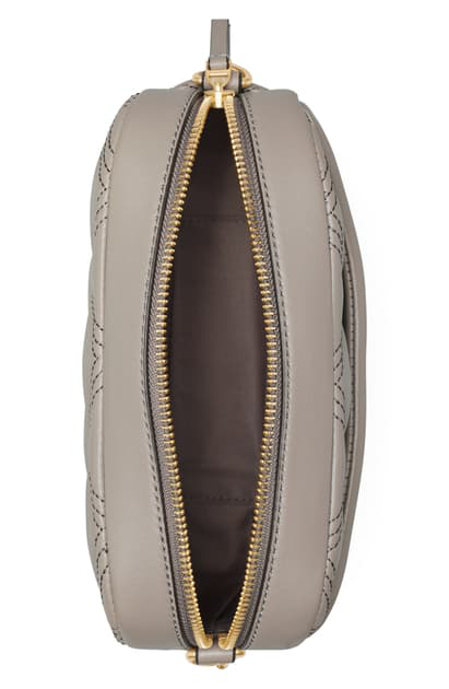 Fleming soft camera bag by tory burch in quilted leather with monogram embossed on the front flat pocket.